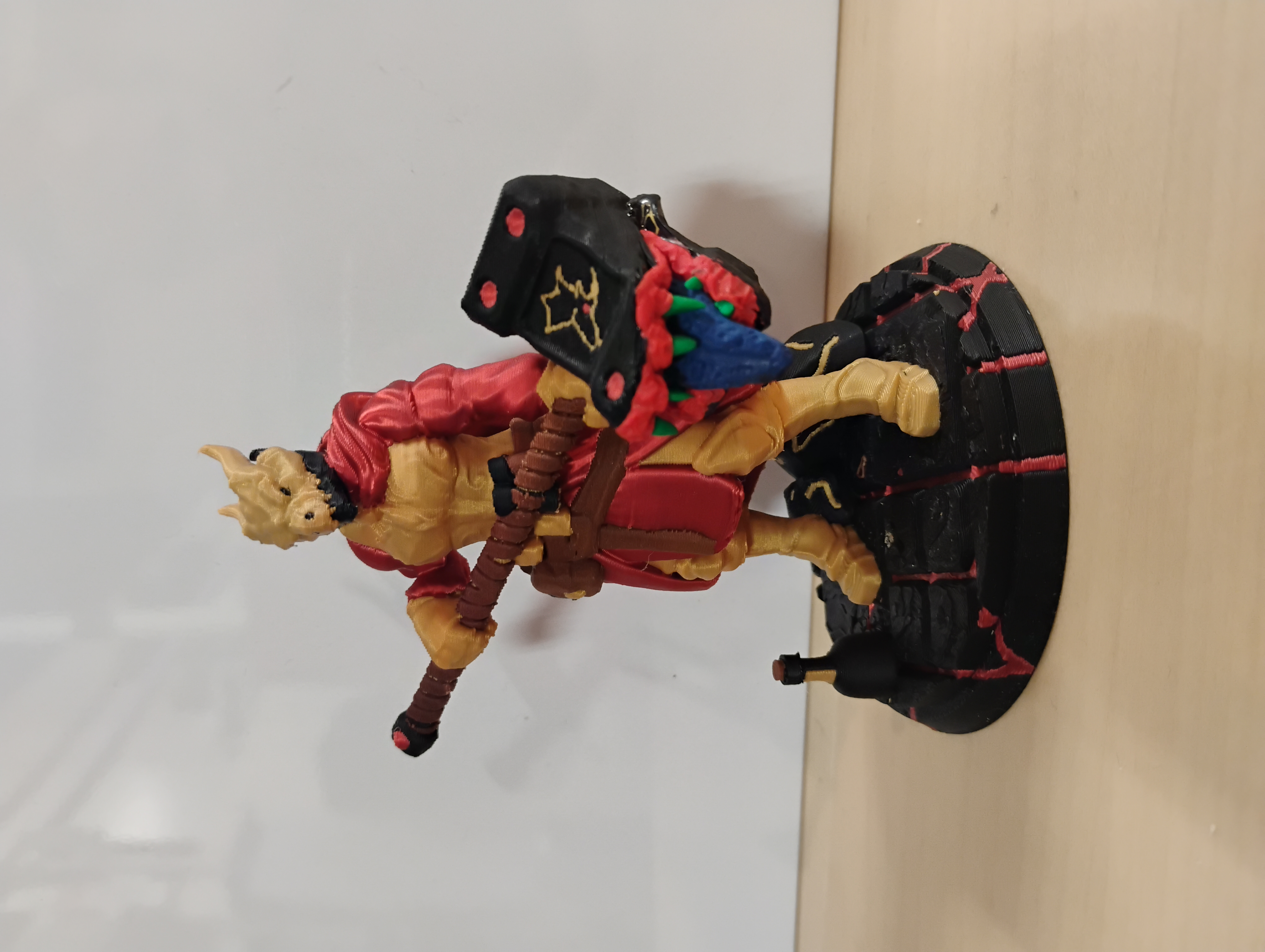 And here is the finished model. The supports for the figure's hammer came unstuck from the print bed causing the lower half to separate from the rest. To correct this for a future print I can make it so the supports are on a raft with the main print. This illustrates the importance of checking the auto-generated supports in orcaslicer before printing. A failed print doesn't have to be a complete loss though; for example here I've used hot glue and air-dry clay to turn the mishap into a new feature.