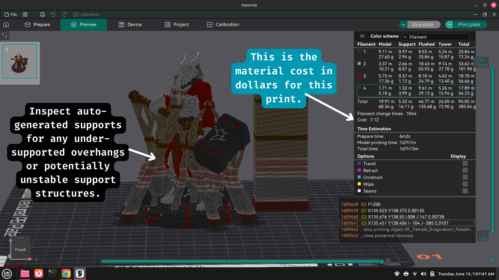 - When you are satisfied with the coloring of your model and all other print settings, click Slice Plate and Orcaslicer will process your model. Look over the sliced model and inspect the supports and any bed adhesion features you have added. Adjust these settings if needed then slice again. Note the cost of the model is displayed among other information after slicing is complete. Remember, materials are not included in your membership so if you used filament from the space please make a donation to cover the cost of the print. To help keep the print area self-sufficient, we ask that you round up to the nearest dollar. In this example I would round the calculated $7.12 up to $8.00. See figure below.