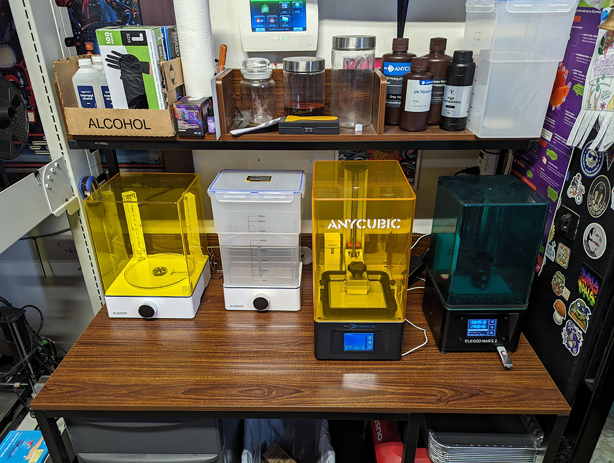 We generally have a bottle or two of resin available – usually gray. We buy the Anycubic or Elegoo brands, as they're plant-based and slightly more environmentally friendly when being produced.